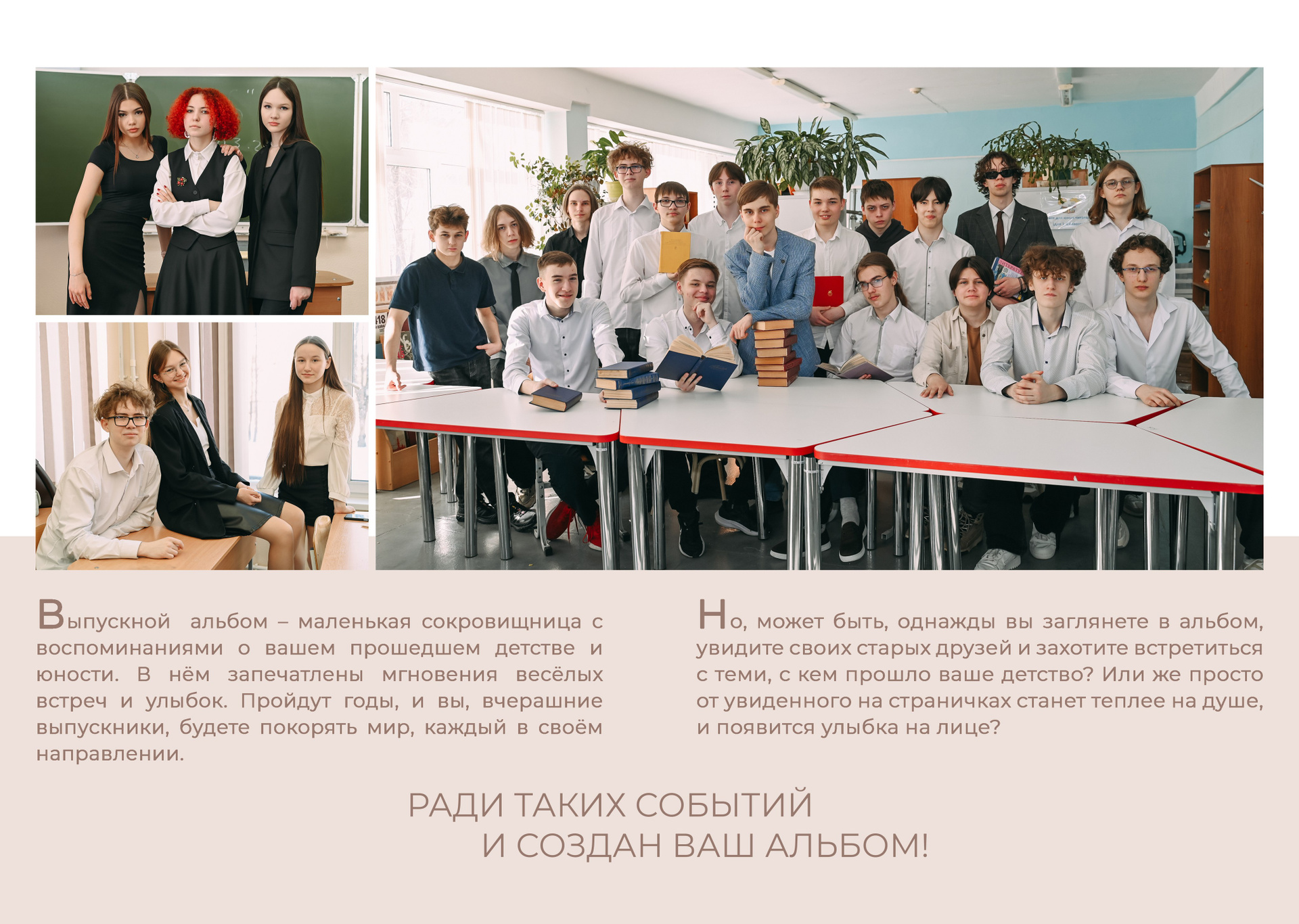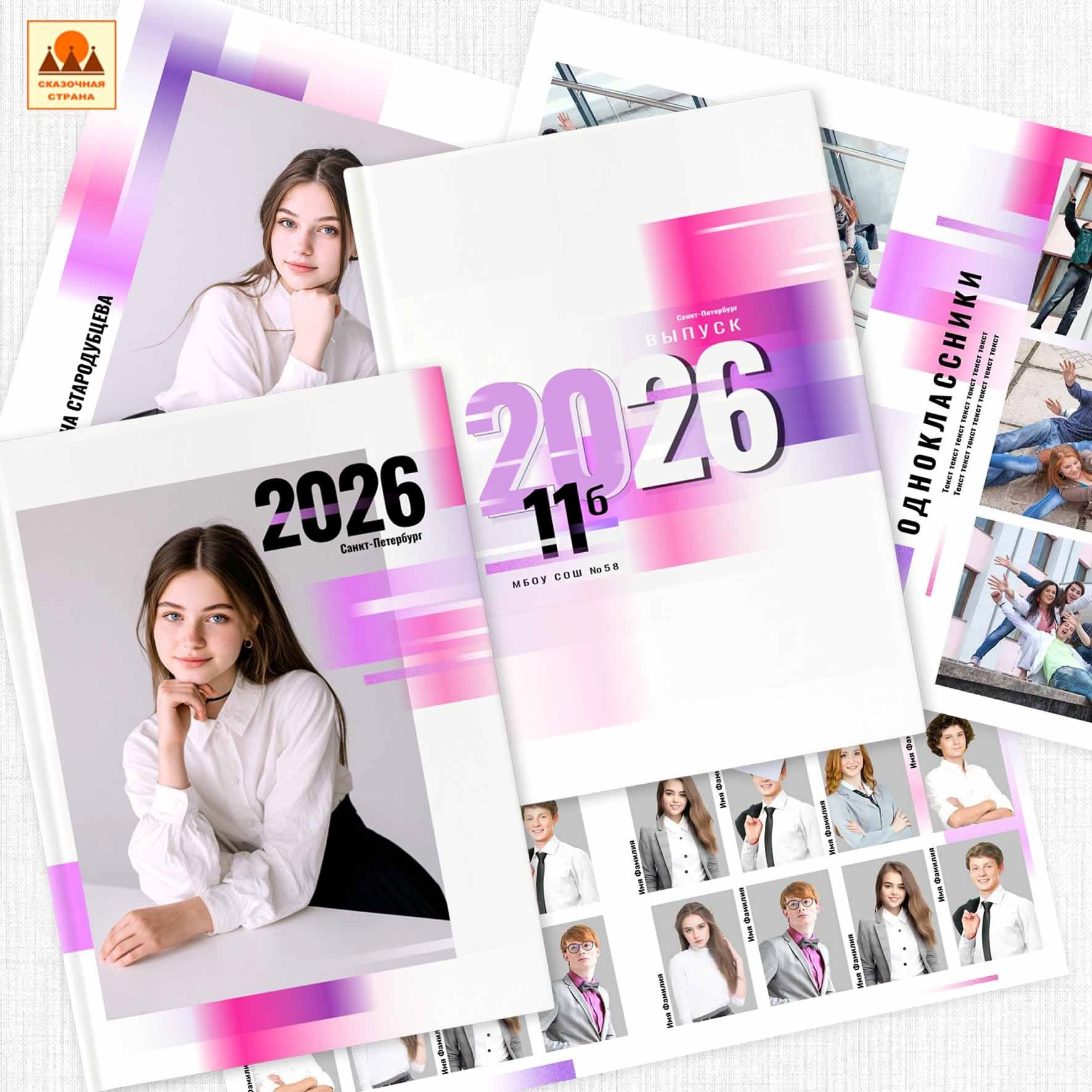 Для каждого класса эти книги разные, т. к. кто-то выбирает съёмку в школе, кто-то в студии (аренда оплачивается отдельно), а кто-то в городе или парке осенью. Количество съёмок может быть 1 или 3, а можно включить ещё и фотографии с выпускного. Это книга про выпускников и им выбирать, что они хотят видеть в своей книге.